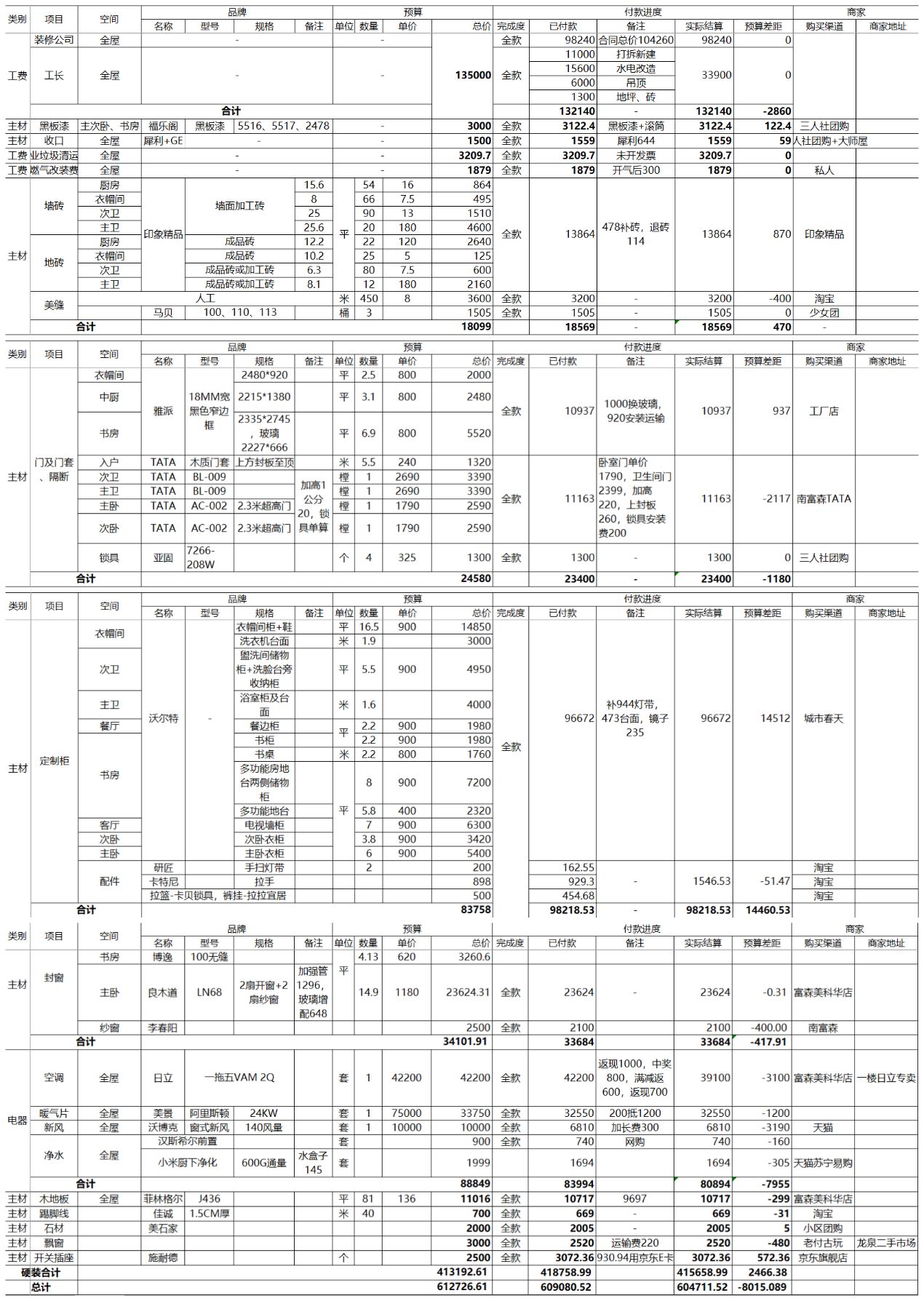 1、2直接影響你買東西花多少錢,3、4直接影響你找人施工花多少錢。想要控制不超支,最好先做裝修預(yù)算。這是一個童鞋自己做的裝修預(yù)算表,相當(dāng)細致:把預(yù)算、實付、優(yōu)惠等信息全都列上,算出總金額,根據(jù)裝修進度隨時修改、完善單項價格,你只要盯住總金額這個數(shù),不超出心理預(yù)期就行。
